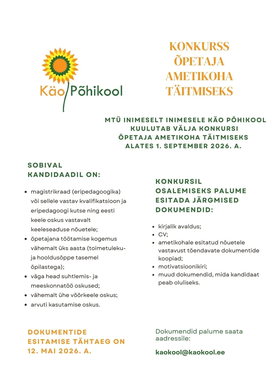 MTÜ Inimeselt Inimesele Käo Põhikool kuulutab välja konkursi õpetaja ametikoha täitmiseks alates 1. september 2026. Dokumendid palume saata aadressile: kaokool@kaokool.ee